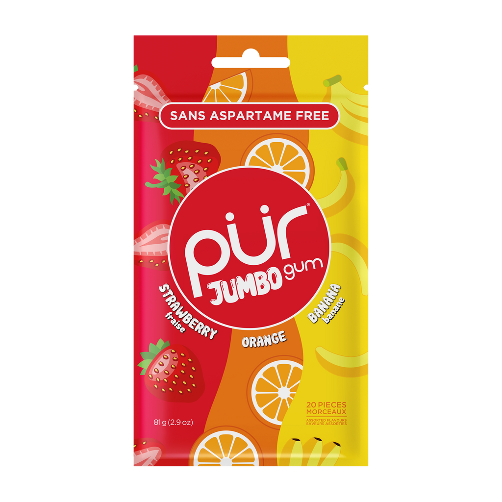 Give your mouth fresh and fruity flavour with PUR Jumbo Gum. This multi-flavour pack has 20 pieces of chewing gum in a convenient resealable bag. Choose between three fun flavours orange, strawberry, and banana. PUR Jumbo Gum does not contain GMOs, gluten, aspartame, or nuts. It is sweetened with xylitol and has a low glycemic index. Reach for a delightful chew with banana, orange and strawberry-flavoured PUR Jumbo Gum. Keep a pack in your bag, your office, and your car for great taste when you want it.
