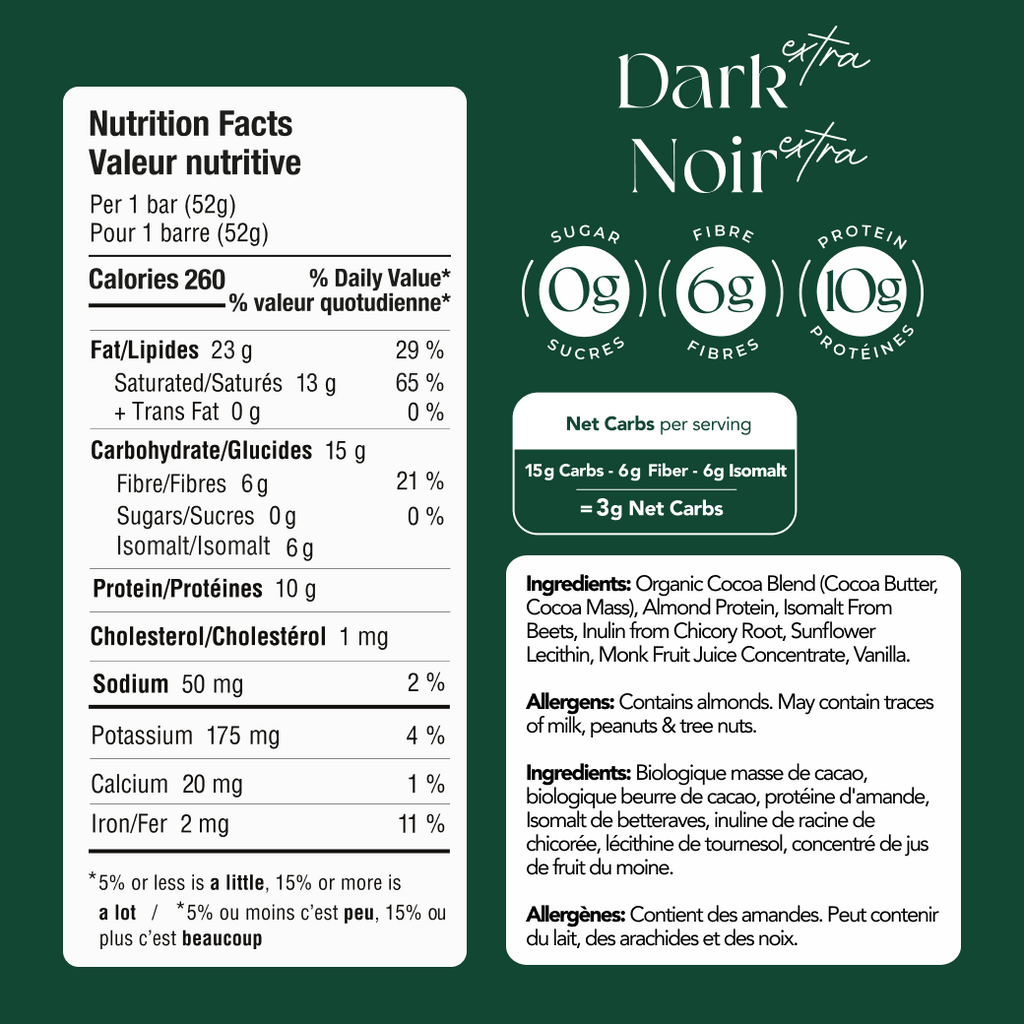 Our 72% dark chocolate uses the perfect blend of rich cocoa mass and cocoa butter to achieve smooth, silky dark chocolate bar. Each bar is fortified with almond protein in our proprietary chocolate process for delectable healthy chocolate all with just 1 gram of net carbs, 10g of protein and 0g of sugar.