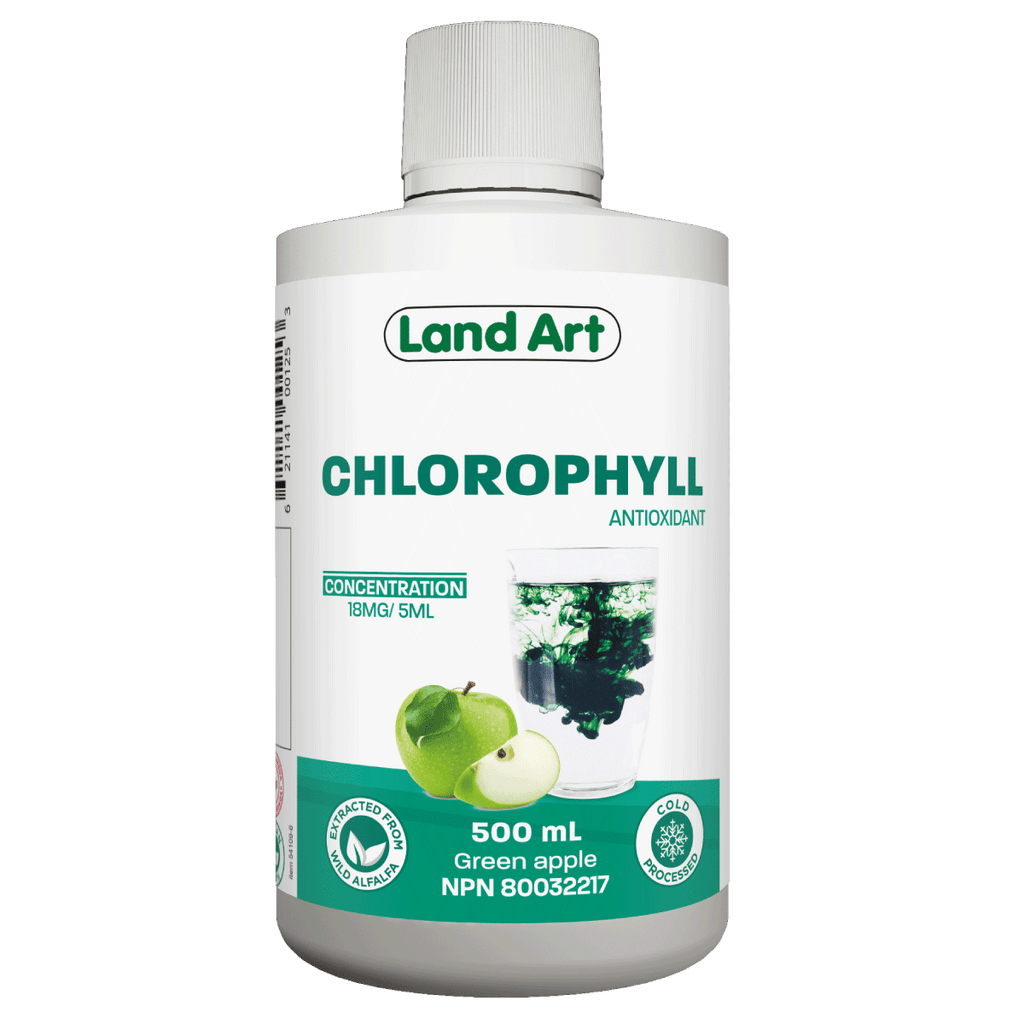 Land Art’s chlorophyll is the very first made in Canada. It comes from non-GMO wild alfalfa of first quality, and it is cold-extracted without chemical solvent, by a supercritical process. Diluted in a glass of water, it is the ultimate health drink.