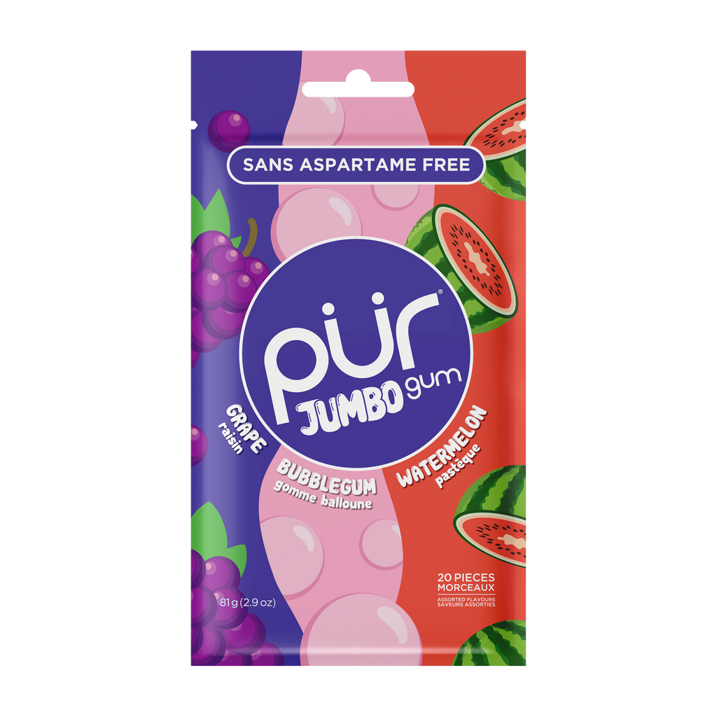 Treat yourself to a tasty break with this pack of Pur Jumbo Gum. This mixed pack of chewing gum gives you a quick flavour burst of Grape, Bubblegum and Watermelon. Made with xylitol, this flavourful snack is low on the glycemic index and does not contain gluten, aspartame or nuts. The resealable bag means you can tuck a pack into a desk drawer, snack on-the-go and share with friends. Snack happy with this chewing gum from Pur.