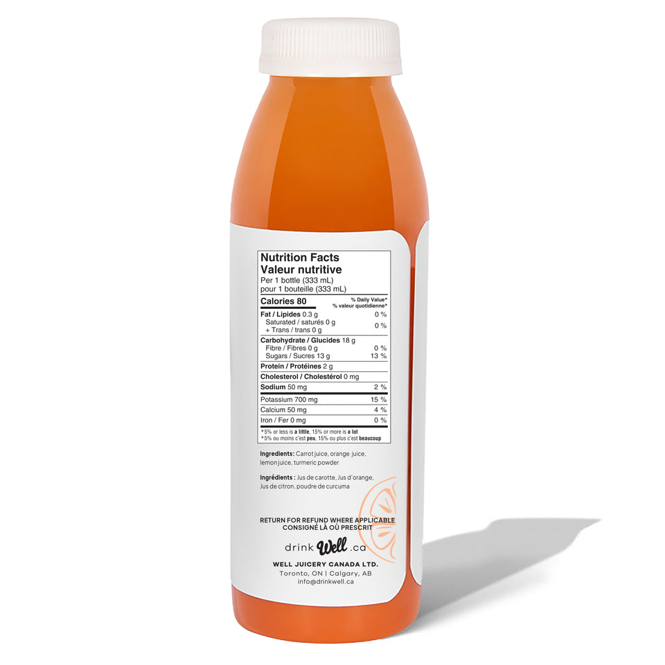 Carrot juice, orange juice, lemon juice, and turmeric juice.
