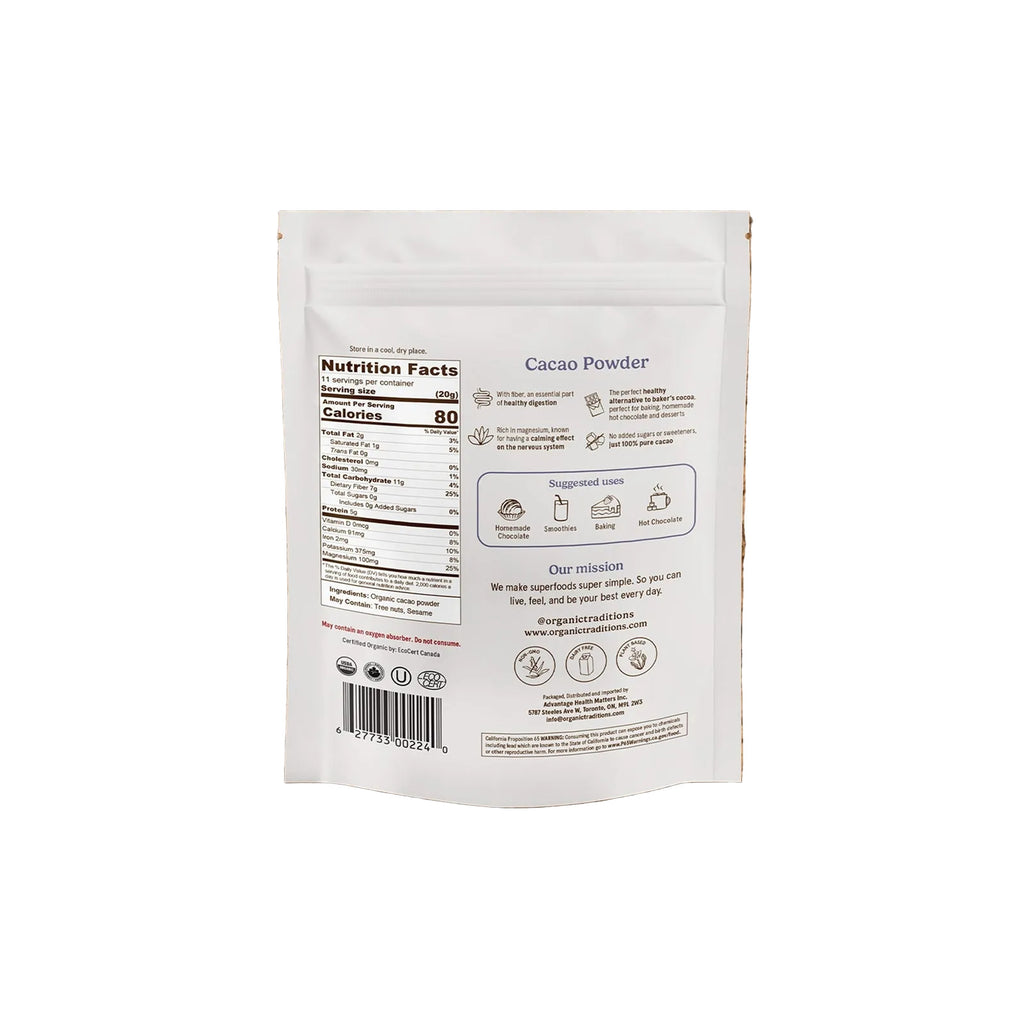 Cacao Powder by Organic Traditions is pure, rich, and natural with no added flavourings or sweeteners. It is gluten-free and vegan-friendly.