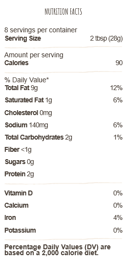Water, grapeseed oil, almonds, lemon juice, soy sauce (water, soybeans, salt), nutritional yeast, garlic, chipotles, vinegar, tomato, smoked paprika and other spices, sea salt, onion powder.