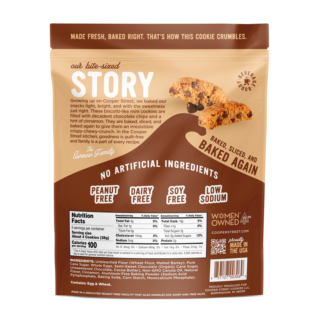 Spice up your day with our Cinnamon Chocolate twice baked cookies! Featuring a delightful blend of warm cinnamon spice and decadent chocolate, these cookies offer a crispy crunch that's irresistible. At just 25 calories per cookie and made without peanuts or anything artificial, they're a guilt-free treat that's perfect for snacking any time. Whether you need a morning boost or a delicious treat in the evening, these dairy-free and soy-free goodies are sure to spice up your snack time.