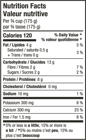 Plant-based yogurt (soybeans, water, bacterial culture), Corn starch, Natural flavours, Inulin, Sugars (fructose), Tricalcium phosphate, Citric acid, Locust bean gum, Guar gum.
