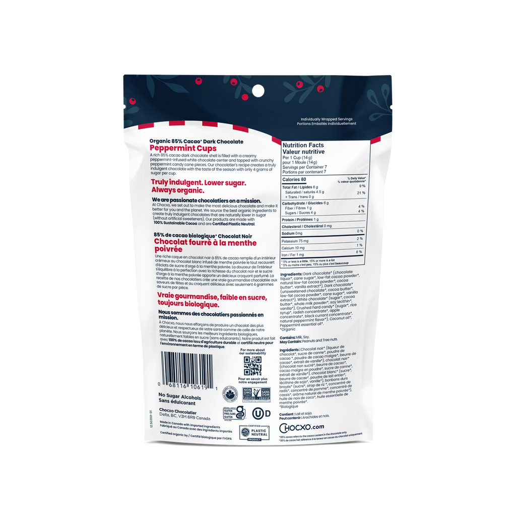 Meet Dark Chocolate Peppermint Cups, the newest holiday-inspired addition to the Chocxo portfolio and a refreshing combo of organic peppermint-infused white chocolate, rich 85% cacao dark chocolate, and a sprinkle of organic peppermint candy cane pieces. With just 4 grams of sugar per cup, this new cup on will put you in the holiday spirit!