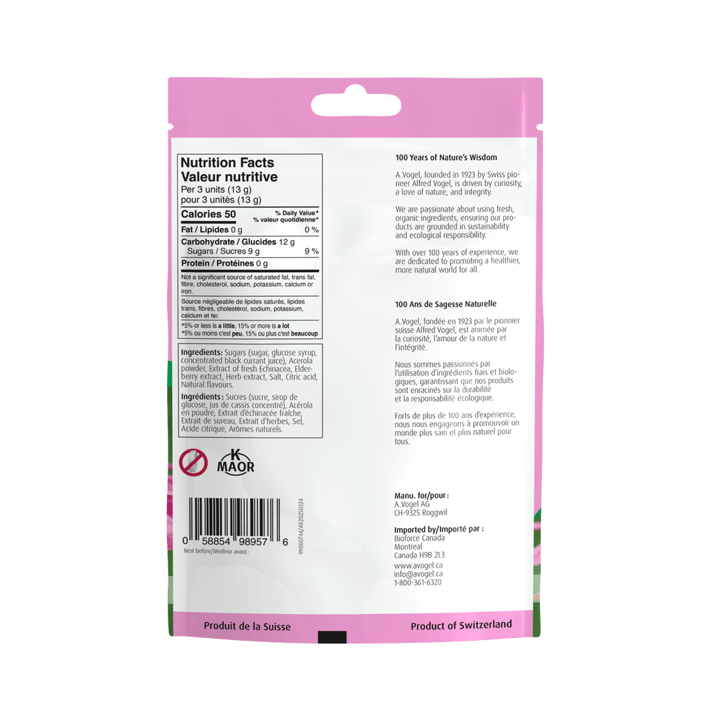 Sugars (sugar, glucose syrup, concentrated black currant juice), acerola powder, extract of fresh echinacea, elderberry extract, herb extract, salt, citric acid, natural flavours.