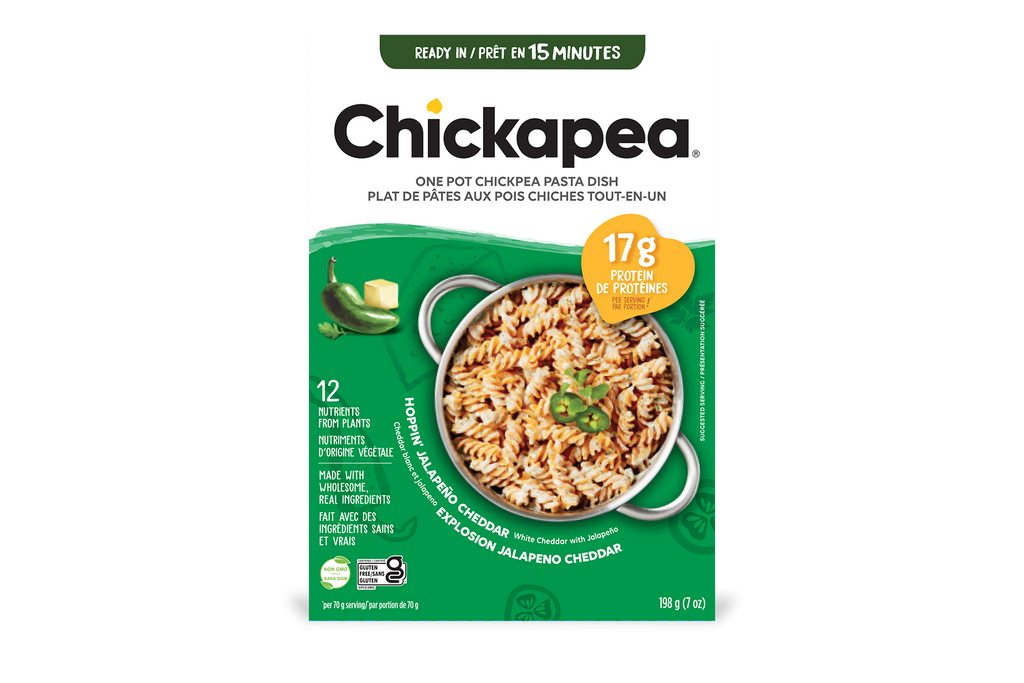 The combination of aged white cheddar and a kick of jalapeno peppers strikes the perfect balance of spicy and savory to add a twist to spiral pasta. What’s different about this pasta is that it contains 17g protein, 5g fibre and 12 nutrients per serving. That’s because Chickapea pasta is made with chickpeas and lentils. Satisfy your pasta craving and give your body the protein and nutrition it needs!