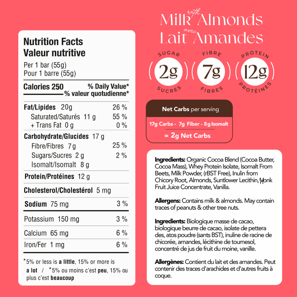Cocoa blend (cocoa butter, cocoa mass), whey protein isolate, erythritol, milk powder (rBST Free), inulin, almonds, sunflower lecithin, stevia leaf extract, natural flavours.