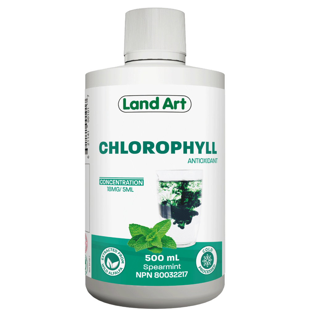Land Art’s chlorophyll is the very first made in Canada. It comes from non-GMO wild alfalfa of first quality, and it is cold-extracted without chemical solvent, by a supercritical process. Diluted in a glass of water, it is the ultimate health drink.