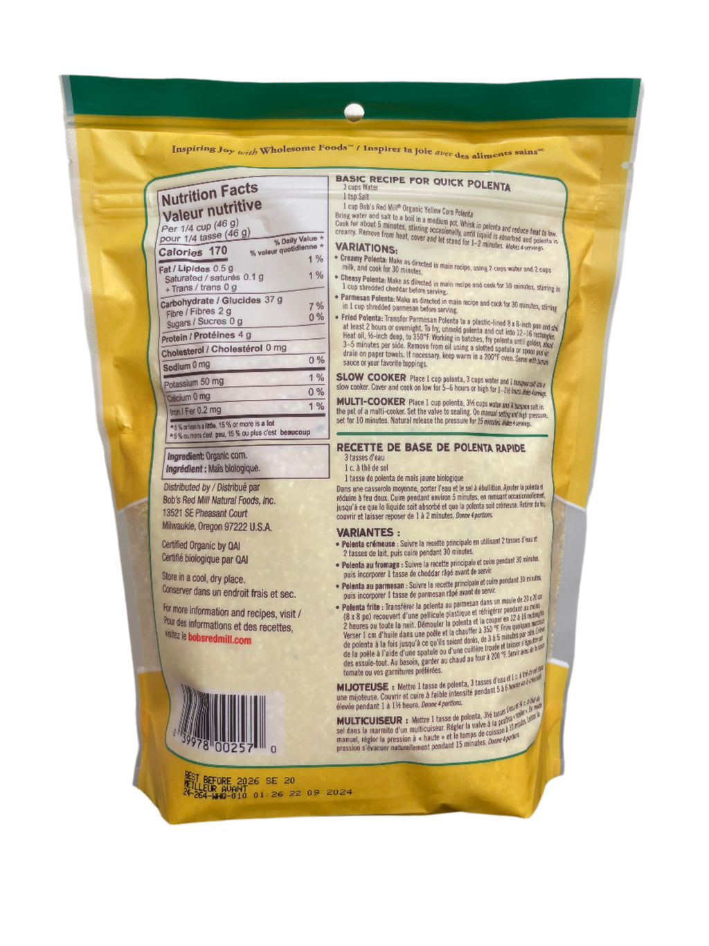 Organic Yellow Corn Polenta cook quickly and make a rich and delicious porridge for breakfast, lunch or dinner. This freshly milled organic corn meal is also the indispensable ingredient for classic Italian polenta.