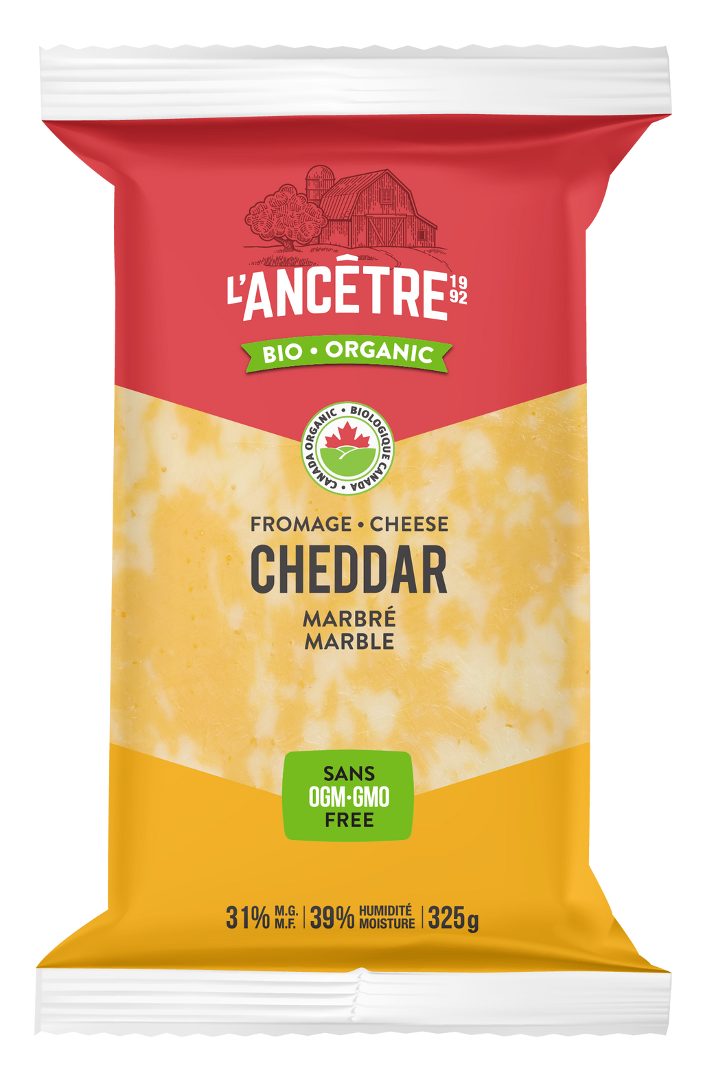This cheddar is made from organic pasteurized milk. Its distinctive, mild flavour is delicately salty and tangy, with a buttery finish. The cream and yellow marbled cheese has a firm, smooth, slightly creamy texture that melts in the mouth.