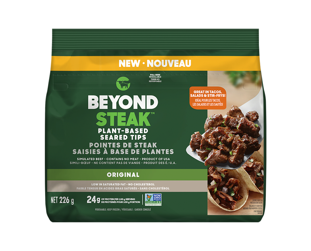 These Beyond Steaks are plant-based seared steak tips that are designed to look and taste just like real steak. Made from simple plant-based ingredients, these seared steak tips are not only delicious, but cook in just 5 minutes. Delicious fajitas, stir fries, salads and more just became that much easier with Beyond Steak.