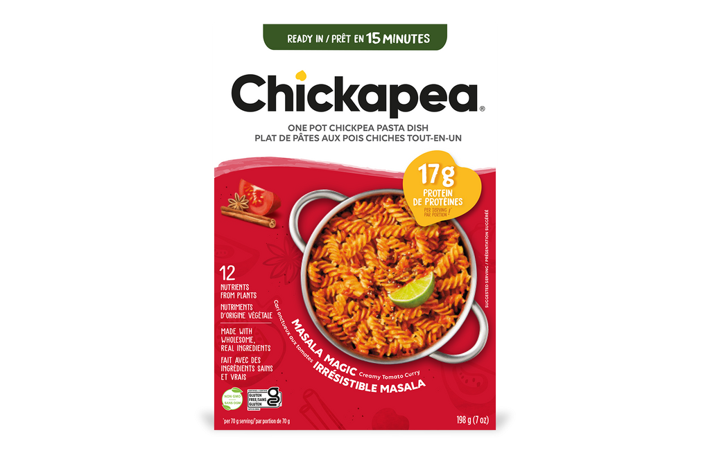A masterful blend of aromatic spices delivers a gentle heat layered with the velvety richness of a “buttery” vegan tomato sauce. What’s different about this pasta is that it contains 17g protein, 5g fibre and 12 nutrients per serving. That’s because Chickapea pasta is made with chickpeas and lentils. Satisfy your pasta craving and give your body the protein and nutrition it needs!