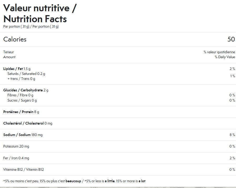 Water, wheat protein, tofu (water, soybeans, magnesium chloride and/or calcium chloride), salt, wheat starch, cider vinegar, onion powder, natural flavours, garlic powder, yeast extract, inactive yeast. Contains : wheat gluten, soy.