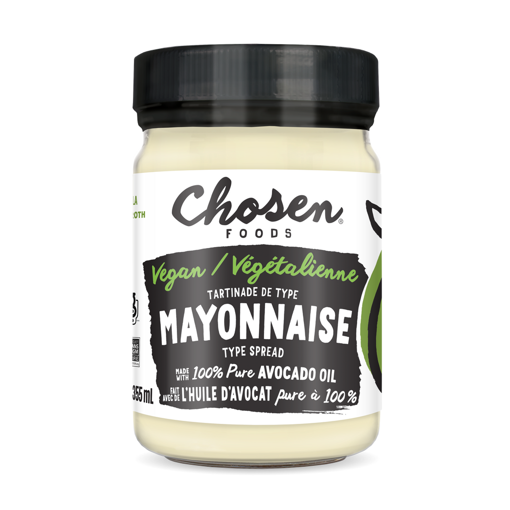 Dress up your plant-based creations with Chosen Foods Vegan Avocado Oil Mayo, made with only avocado oil, aquafaba from garbanzo beans, fava bean protein, organic vinegar, organic sugar, and organic mustard.